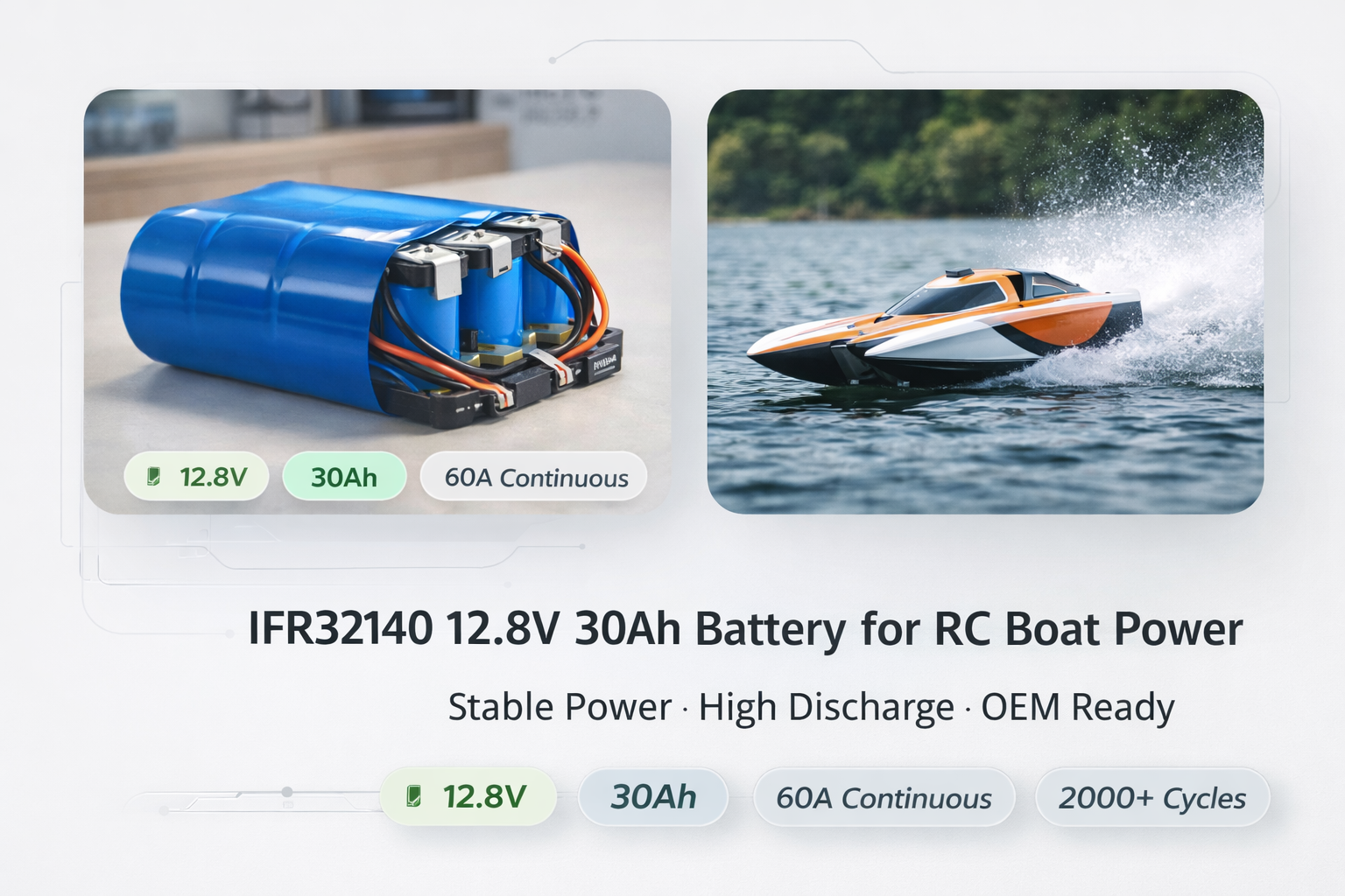 low IR (≤ 60mΩ), strong continuous discharge, and a safe LiFePO4 chemistry to reduce risk in outdoor water environments.